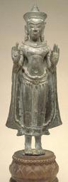 Keywords: Cambodian - Standing Crowned Buddha - Walters 542728.jpg conj or Cambodia Buddhism became increasingly important in Cambodia during the late 11th century especially at the temple site of Phimai in present-day Thailand The Buddha was frequently depicted with the crown and jewelry of a king These attributes could indicate the mystical identity of all Buddhas past and present; they could stand for the attainment of nirvana; and in addition they could refer to a miracle involving the magical transformation of the Buddha in order to convert a heretic king early Other date century 12 bronze cm 17 2 with tang cm 18 2 accession number 54 2728 2224 Private collection Thonburi prior to April 13 1951 Alexander B Griswold Monkton April 13 1951 presented to the Breezewood Foundation December 1960 inv no 476 Walters Art Museum Henry Walters Bequest of A B Griswold 1992 no Unearthly Elegance Buddhist Art from the Griswold Collection The Walters Art Gallery Baltimore 1995 place of origin Cambodia Walters Art Museum license Southeast Asian art in the Walters Art Museum Sculptures from Cambodia Media contributed by the Walters Art Museum needs category review