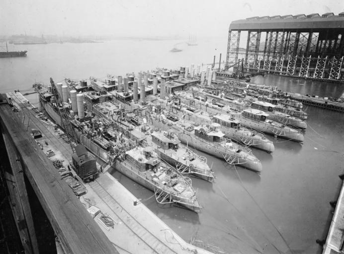 | Keywords: Camden Shipyard 1919.jpg View of the New York Shipbuilding Corporation shipyard Camden New Jersey USA in May 1919 Seven Wickes-class destroyers and a Clemson-class destroyer are fitting out These ships are from left to right USS Dickerson Destroyer 157 builder's hull 216 ; USS Leary Destroyer 158 builder's hull 217 ; USS Schenck Destroyer 159 builder's hull 218 ; USS Herbert Destroyer 160 builder's hull 219 ; USS Brooks Destroyer 232 builder's hull 221 ; USS Hatfield Destroyer 231 builder's hull 220 ; USS Babbitt Destroyer 128 builder's hull 213 and USS DeLong Destroyer 129 builder's hull 214 <br> Note the triple torpedo tubes on the wharf in the center foreground and the destroyer smokestacks in the lower left Official U S Navy photo http //www history navy mil/our-collections/photography/numerical-list-of-images/nhhc-series/nh-series/NH-43000/NH-43196 html NH 43196 from the U S Navy http //www history navy mil Naval History and Heritage Command 1919-05 U S Navy PD-USGov-Military-Navy original upload log page en wikipedia Camden_Shipyard_1919 jpg 2007-09-09 00 04 Zscout370 740×605×8 140799 bytes Photo NH 42530 New York Shipbuilding Corporation shipyard Camden New Jersey Destroyers fitting out circa May 1919 These ships are from left to right Dickerson Destroyer 157 builder's hull 216 ; Leary Destroyer 158 builder's h New York Shipbuilding Company 1919 in New Jersey Black and white photographs of New Jersey USS Babbitt DD-128 USS DeLong DD-129 USS Dickerson DD-157 USS Leary DD-158 Category USS Schenck DD-159 USS Herbert DD-160 USS Brooks DD-232 USS Hatfield DD-231 |