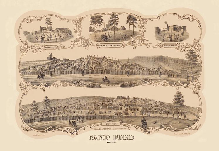 | Keywords: Camp Ford Lithograph.tif en Wood cut engraving of the Camp Ford Prison Camp Tyler Texas Originally drawn by Corp James S McClain F 120th Ohio Infantry captured on May 3 1864 and held as a prisoner of war until the final exchange of prisoners on May 27 1865 The inserts show left - the camp hospital located south of the prison; center - the headquarters of Col Reuben R Brown 35th Texas Cavalry who was in command of the camp from September 1864 until the war's end and right - the cabin of Captain Elias Fraunfelter Co F 120th Ohio Captured on the Red River May 3 1864 exchanged May 27 1865 Note that there is an engraver's error as the name shows as Braunfelter 2013-10-17 22 44 16 Andreas A T History of Chicago From the Earliest Period to the Present Time In 3 Vols Vol II From 1857 until the fire of 1871 A T Andreas Company Chicago 1885 James S McLain Corp Co F 120th Ohio Inf POW May 3 1864- May 27 1865 PD-US Uploaded with UploadWizard Public domain Uncategorized 2013 October 18 |