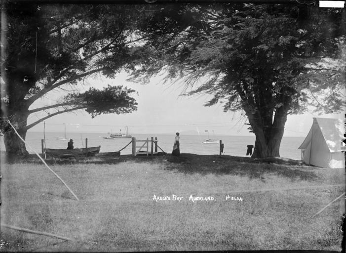 Keywords: blackandwhite monochrome outdoor black and white View of Arkles Bay looking out to the bay, taken from between two large macrocarpa trees on the beachfront. The ferry can be seen in the bay heading south as well as a yacht and launch. A woman is standing looking out at the ferry and a man is sitting on a dinghy under the trees. On the righthand side is a canvas tent. Taken by William A Price in early 1900s. Inscriptions: Inscribed - Photographer's title on negative -bottom centre: Arkle's Bay. Auckland. No 845A.. William Archer Price lived and practised in Queen Street, Northcote, 1909-1910. Source: New Zealand Post Office directories Quantity: 1 b&w original negative(s). Physical Description: Dry plate glass negative 4.5 x 6.5 inches Camp site at Arkles Bay, Auckland. Price, William Archer, 1866-1948 :Collection of post card negatives. Ref: 1/2-001403-G. Alexander Turnbull Library, Wellington, New Zealand. natlib.govt.nz/records/22854347 View of Arkles Bay looking out to the bay, taken from between two large macrocarpa trees on the beachfront. The ferry can be seen in the bay heading south as well as a yacht and launch. A woman is standing looking out at the ferry and a man is sitting on a dinghy under the trees. On the righthand side is a canvas tent. Taken by William A Price in early 1900s. Inscriptions: Inscribed - Photographer's title on negative -bottom centre: Arkle's Bay. Auckland. No 845A.. William Archer Price lived and practised in Queen Street, Northcote, 1909-1910. Source: New Zealand Post Office directories Quantity: 1 b&w original negative(s). Physical Description: Dry plate glass negative 4.5 x 6.5 inches Camp site at Arkles Bay, Auckland. Price, William Archer, 1866-1948 :Collection of post card negatives. Ref: 1/2-001403-G. Alexander Turnbull Library, Wellington, New Zealand. natlib.govt.nz/records/22854347 |