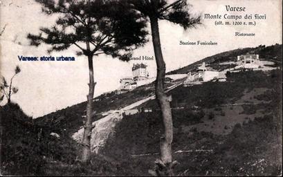 Keywords: Il complesso turistico del Campo dei Fiori appena completato. Al centro il Grand Hotel (terminato nel 1912) a destra la stazione a monte della funicolare e il Ristorante Campo dei Fiori (entrambe completate nel 1911). Tutte e tre le opere sono state progettate dall'arch. Giuseppe Sommaruga tra il 1908 e il 1910. In alto le tre croci e i versanti della montagna completamente privi di copertura vegetale. varese funicolare campodeifiori |