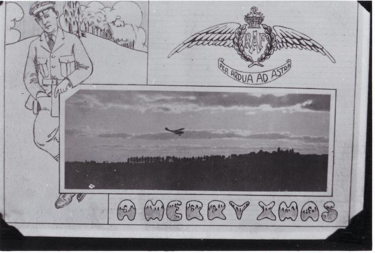 Keywords: world war i worldwari christmas cards christmascards 1910s drawings christmas blackandwhite black and white Photograph of front of a Royal Air Force Christmas card, with a drawing of the RAF crest and motto "Per Ardua ad Astra", the words "A Merry Xmas" and an airman arranged around a photograph of an aircraft flying over trees. A note on the back states that the card is from Camp Rathbun, the Royal Flying Corps training camp north of Deseronto, Ontario. 1918. Photograph of front of a Royal Air Force Christmas card, with a drawing of the RAF crest and motto "Per Ardua ad Astra", the words "A Merry Xmas" and an airman arranged around a photograph of an aircraft flying over trees. A note on the back states that the card is from Camp Rathbun, the Royal Flying Corps training camp north of Deseronto, Ontario. 1918. |