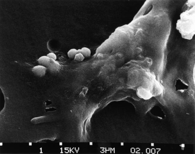 | Keywords: Cancer cells- death (step 4).jpg Step-four of a six-step sequence of the death of a cancer cell A cancer cell has migrated through the holes of a matrix coated membrane from the top to the bottom simulating natural migration of a invading cancer cell between and sometimes through the vascular endothelium As the macrophage cell becomes smooth step 4 Photo magnification x26 000 See also http //visuals nci nih gov/details cfm imageid 2369 http //visuals nci nih gov/details cfm imageid 2370 http //visuals nci nih gov/details cfm imageid 2371 http //visuals nci nih gov/details cfm imageid 2372 http //visuals nci nih gov/details cfm imageid 2373 Topics/Categories Cells or Tissue Abnormal Cells or Tissue Type B W Photo Source Dr Raowf Guirguis National Cancer Institute Susan Arnold Photographer 2371 1988-10 Reuse Restrictions None - This image is in the public domain and can be freely reused Please credit the source and/or author listed above Susan Arnold Photographer PD-USGov-HHS-NIH Media from National Cancer Institute Visuals Online Images uploaded by Fæ |