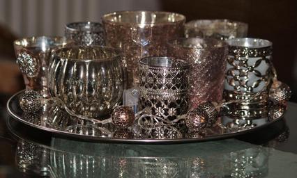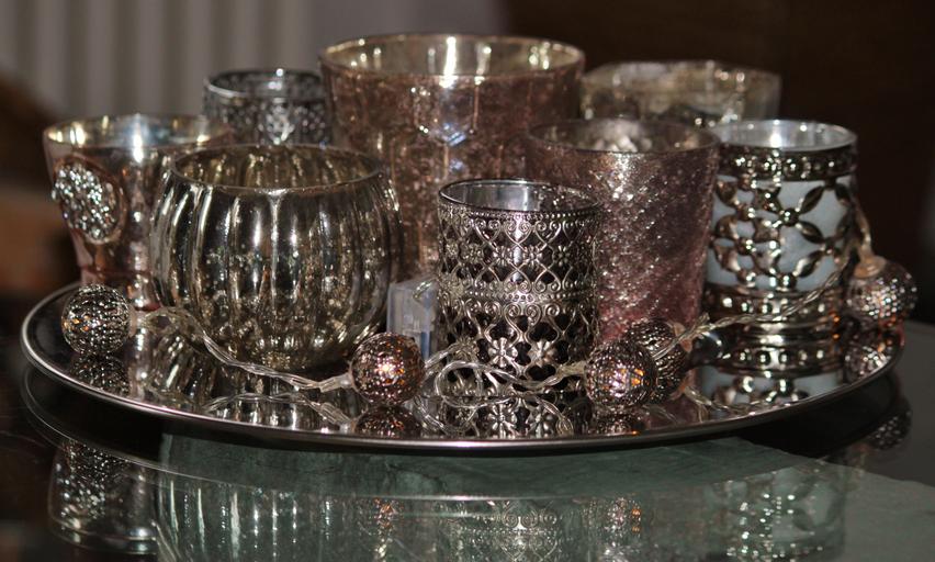 Keywords: candles tea light holder glasses deco mood candlestick lights decorated ornament atmosphere mirroring shiny silver silvery polished plate tray silver tray silver plate