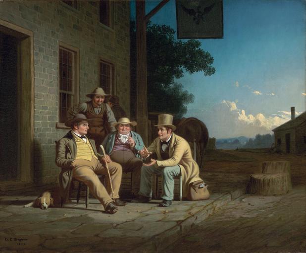 Keywords: George Caleb Bingham was active in Missouri politics for most of his adult life. Canvassing for a Vote reflects his full faith in the democratic system, even as he recognized its shortcomings. Set in the artist’s hometown of Arrow Rock, Missouri, the composition shows a politician and trio of potential voters in a solid pyramid at the center of the painting, representing the campaign process at work. Bingham also suggests some of the problems of 1850s American politics. A sleeping dog and a man whose back is turned to the solicitation may imply political disenfranchisement and disinterested citizens. Bingham may also be commenting on the dubious character of certain politicians by placing the horse’s rump in line with the canvasser’s head. Read more at Canvassing for a Vote - 1852. (Google Art Project) George Caleb Bingham was active in Missouri politics for most of his adult life. Canvassing for a Vote reflects his full faith in the democratic system, even as he recognized its shortcomings. Set in the artist’s hometown of Arrow Rock, Missouri, the composition shows a politician and trio of potential voters in a solid pyramid at the center of the painting, representing the campaign process at work. Bingham also suggests some of the problems of 1850s American politics. A sleeping dog and a man whose back is turned to the solicitation may imply political disenfranchisement and disinterested citizens. Bingham may also be commenting on the dubious character of certain politicians by placing the horse’s rump in line with the canvasser’s head. Read more at Canvassing for a Vote - 1852. (Google Art Project) |