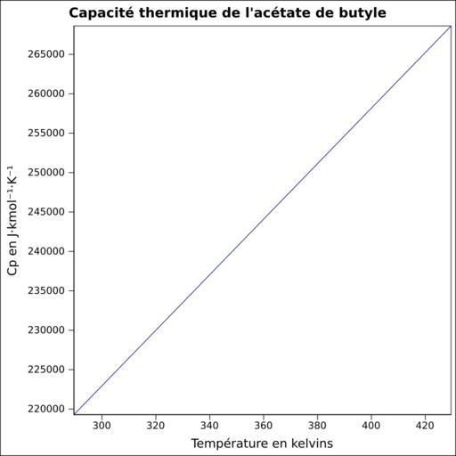 | Keywords: Capacité thermique acétate de butyle.svg fr Capacité thermique liquide calculée d'après <br/> Robert H Perry et Donald W Green Perry's Chemical Engineers' Handbook McGraw-Hill USA 1997 7e éd 2400 p ISBN 0-07-049841-5 p 2-170 own Epop 2010-06-28 Created with Gnumeric Heat capacity |