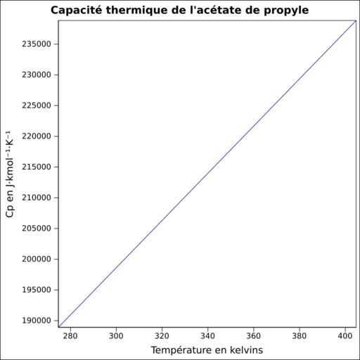 | Keywords: Capacité thermique acétate de propyle.svg fr Capacité thermique liquide calculée d'après <br/> Robert H Perry et Donald W Green Perry's Chemical Engineers' Handbook McGraw-Hill USA 1997 7e éd 2400 p ISBN 0-07-049841-5 p 2-170 own Epop 2010-06-28 Created with Gnumeric Heat capacity |