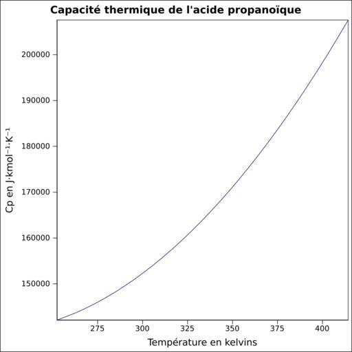 | Keywords: Capacité thermique acide propanoïque.svg fr Capacité thermique liquide calculée d'après <br/> Robert H Perry et Donald W Green Perry's Chemical Engineers' Handbook McGraw-Hill USA 1997 7e éd 2400 p ISBN 0-07-049841-5 p 2-170 own Epop 2010-06-28 Created with Gnumeric Heat capacity |
