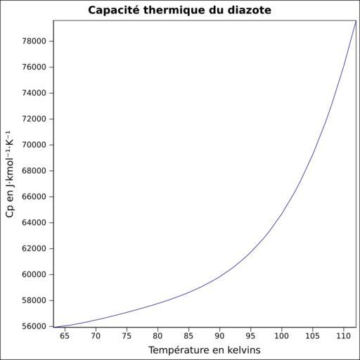 | Keywords: Capacité thermique diazote.svg fr Capacité thermique liquide calculée d'après <br/> Robert H Perry et Donald W Green Perry's Chemical Engineers' Handbook McGraw-Hill USA 1997 7e éd 2400 p ISBN 0-07-049841-5 p 2-170 own Epop 2010-06-28 Created with Gnumeric Heat capacity |
