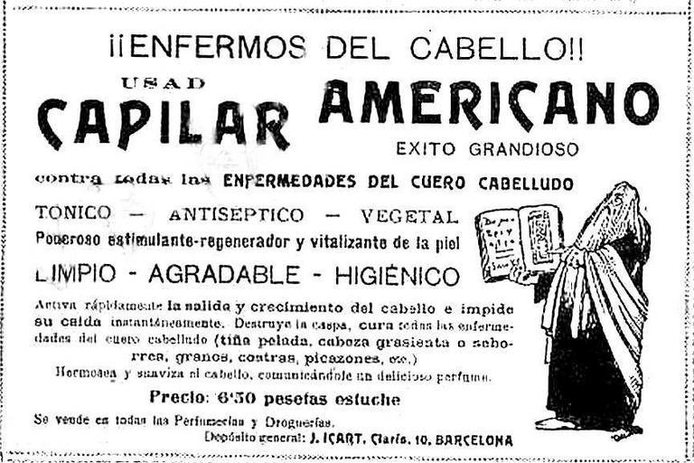 Keywords: Capilar-Americano-1919-07-12.jpg it Capilar Americano - inserzione pubblicitaria Hormiga de oro - ilustracion catolica Barcelona 12 7 1919 n 27 J Icart Claris 10 Barcelona 12 7 1919 <center> ENFERMOS DEL CABELLO Usad CAPILAR AMERICANO exito grandioso Contra todas las enfermedades del cuero cabelludo TONICO “ ANTISEPTICO “ VEGETAL Poderoso estimulante-regenerador y vitalizzante de la piel LIMPIO “ AGRADABLE “ HIGIENICO Activa rapidamente la salida y crecimiento del cabello e impide su caida istantaneamente Destruye la caspa cura demas las enfermedades del cuero cabelludo tiña pelada cabeza grasienta o seborrea granos costras picazones ecc Hermosea y suaviza el cabello comunicandole un delizioso perfume PRECIO 6 50 PESETAS ESTUCHE SE VENDE EN TODAS las Perfumerias y Droguerias Deposito general J ICART Claris 10 Barcelona </center> PD-old ImageNote 1 44 27 780 539 865 577 2 <center> ENFERMOS DEL CABELLO Usad CAPILAR AMERICANO exito grandioso Contra todas las enfermedades del cuero cabelludo TONICO “ ANTISEPTICO “ VEGETAL Poderoso estimulante-regenerador y vitalizzante de la piel LIMPIO “ AGRADABLE “ HIGIENICO Activa rapidamente la salida y crecimiento del cabello e impide su caida istantaneamente Destruye la caspa cura demas las enfermedades del cuero cabelludo tiña pelada cabeza grasienta o seborrea granos costras picazones ecc Hermosea y suaviza el cabello comunicandole un delizioso perfume PRECIO 6 50 PESETAS ESTUCHE SE VENDE EN TODAS las Perfumerias y Droguerias Deposito general J ICART Claris 10 Barcelona </center> ImageNoteEnd 1 Capilar Americano 1919 advertisements in Spain July 1919 in Spain Perfumeria Icart Barcelona Perfume advertisement |