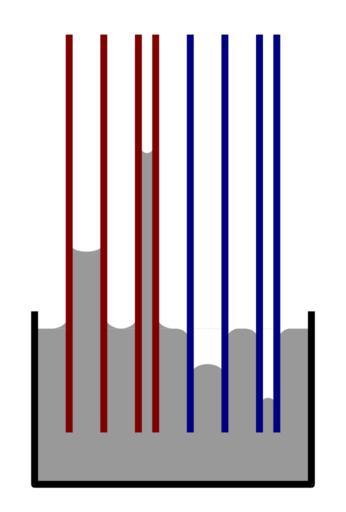 Keywords: CapillaryAction.svg ilustrácia - kapilárna elevácia v závislosti od priemeru kapiláry a materiálu z ktrého je vyrobená kapilára Červenou zmáčaný povrch modrou - nezmáčaný povrch Own 2007-02-17 Eduard Konečný Surface tension diagrams Capillary action |