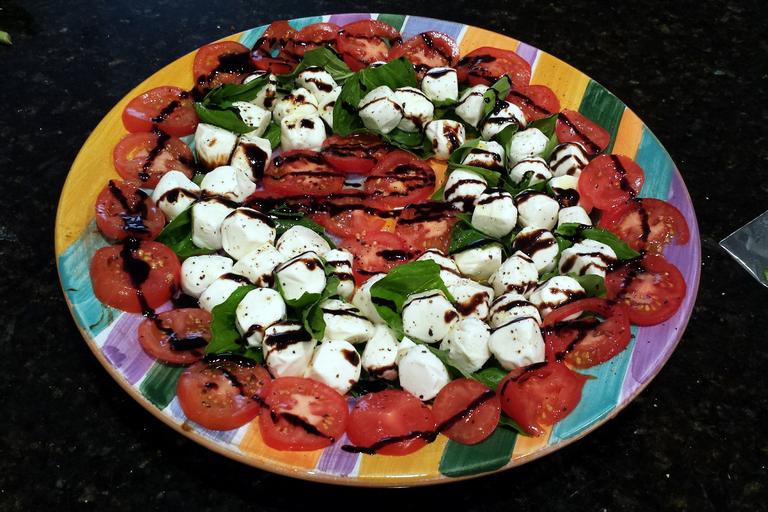 Keywords: caprese salad mozzarella tomatoes fresh basil basil olive oil layered salad cheese balsamic vinegar drizzle food party plate fresh healthy snack gourmet green yellow sliced red sweet round home delicious