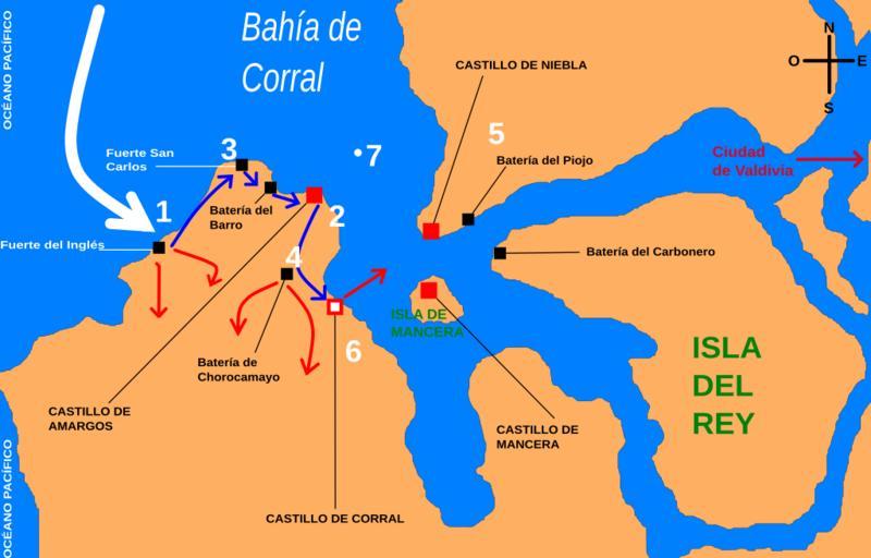 Keywords: Capture of Valdivia-es.svg Map of the capture of Valdivia during the Chilean War of Independece Español tomado de es Toma de Valdivia Simbología En color rojo Castillos del sistema de defensa de Valdivia En color negro Baterías y reductos menores del sistema de defensa Líneas blancas movimiento de la escuadra chilena Líneas azules movimiento de las fuerzas patriotas Líneas rojas desbande y huida de las fuerzas realistas Punto 1 Desembarco de las fuerzas patriota al mando del Mayor Miller Punto 2 Ruta terrestre del Mayor Beauchef y Miller Punto 3 Navegación del Intrépido y la Moctezuma hacia Corral El Intrépido vara Punto 4 Huida de las fuerzas realistas Punto 5 Rendición de los fuertes de la ribera norte Punto 6 Lord Cochrane se reúne con sus tropas en Corral Punto 7 La fragata O'Higgins avanza por la bahía de Valdivia Own November the 3rd 2007 Original by Valo3 ; vectorized by ZStardust Mapatomadevaldivia PNG Translation possible Valdivia Maps of the history of Chile SVG maps showing history in Spanish |