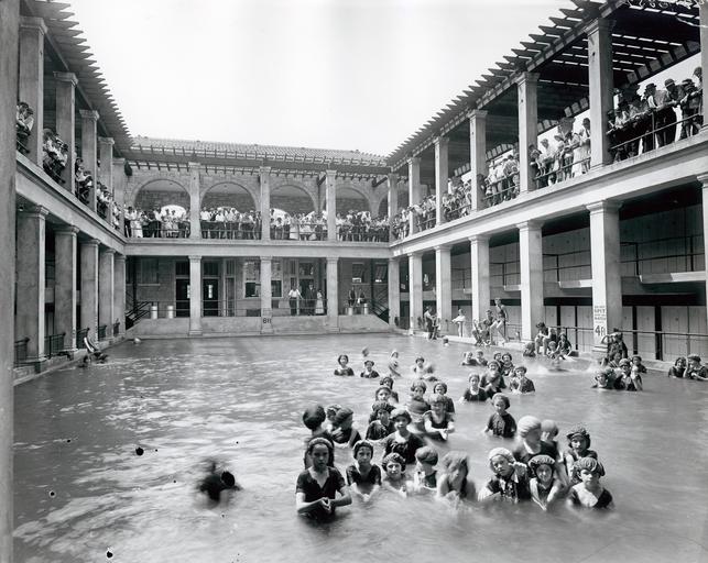 | Keywords: road architecture building colonnade outdoor Girls in a swimming class entertain an audience of neighborhood residents at Mullanphy Pool, at Eleventh Street, between Cass Avenue and Mullanphy. The injunctions against spitting in the water remind of the ever-present threat of tuberculosis.  Photograph, 1914.  Girls in a swimming class entertain an audience of neighborhood residents at Mullanphy Pool, at Eleventh Street, between Cass Avenue and Mullanphy. The injunctions against spitting in the water remind of the ever-present threat of tuberculosis.  Photograph, 1914.   |