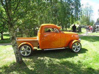 Keywords: car show truck orange grass tree people skara sweden