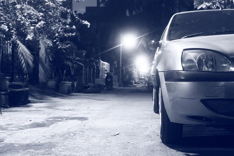 Keywords: car street night india blue road urban city