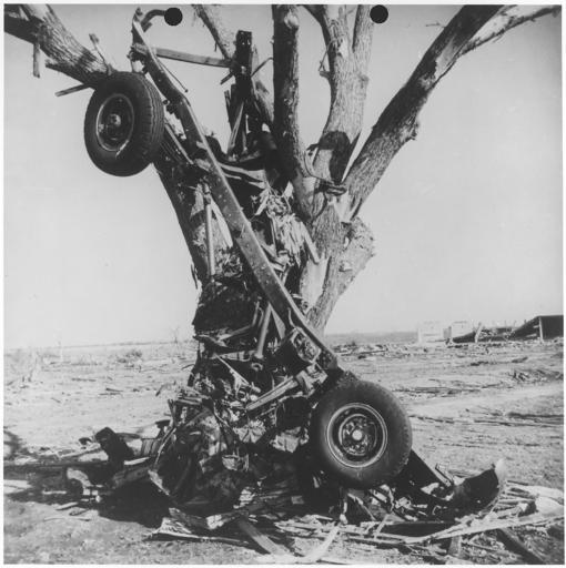 | Keywords: Car wrapped around large tree by tornado. Udall, Kansas - NARA - 283887.jpg Scope and content General notes 283887 Local identifier Department of Agriculture Weather Bureau Central Regional Weather Bureau Office ca 1935 - 1965 NARA's Central Plains Region Kansas City NREA 400 West Pershing Road Kansas City MO 64108 1955-05-25 Record group Record Group 27 Records of the Weather Bureau 1735 - 1989 Record group ARC 356 Decimal Correspondence Files compiled 1950 - 1964 Series ARC 283871 File unit File unit ARC Variant control numbers NAIL Control Number NRE-27-KCRO DF -46 Other versions <gallery> File Car_wrapped_around_large_tree_by_tornado _Udall _Kansas_-_NARA_-_283887 tif tif File Car_wrapped_around_large_tree_by_tornado _Udall _Kansas_-_NARA_-_283887 jpg jpg </gallery> NARA-cooperation PD-USGov Tornadoes of 1955 Tornado damage Tornadoes in Kansas Udall Kansas Trees in Kansas |