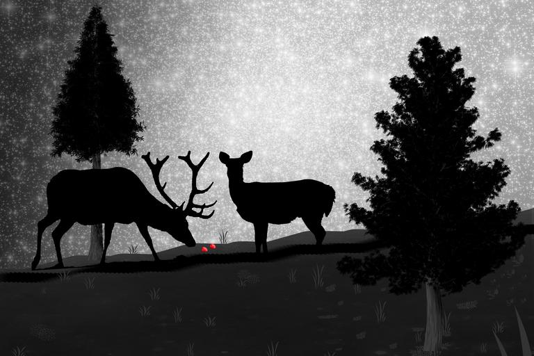 | Keywords: caribou reindeer deer silhouette nature antlers wildlife rangifer tarandus animal mammal night sky stars night pine trees environment forest habitat ecology monochrome monochromatic black and white wilderness natural wild tree landscape pine spruce fir coniferous evergreen woodland scenic background |