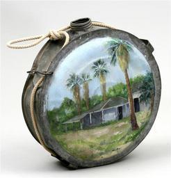 Keywords: Carl Eytel canteen (DEVA4033).jpg en Canteen 1910 Made by Carl A Eytel Art depicting the region occasionally had utilitarian value such as this painted canteen showing buildings in a desert palm grove Metal rope oil Dia 22 W 8 cm Death Valley National Park DEVA 4033 1910 http //www nps gov/history/museum/exhibits/death_valley/mining_ranching html Carl Eytel photo U S Department of the Interior PD-USGov Uploaded with UploadWizard Carl Eytel Death Valley National Park Canteens California in the 1910s |