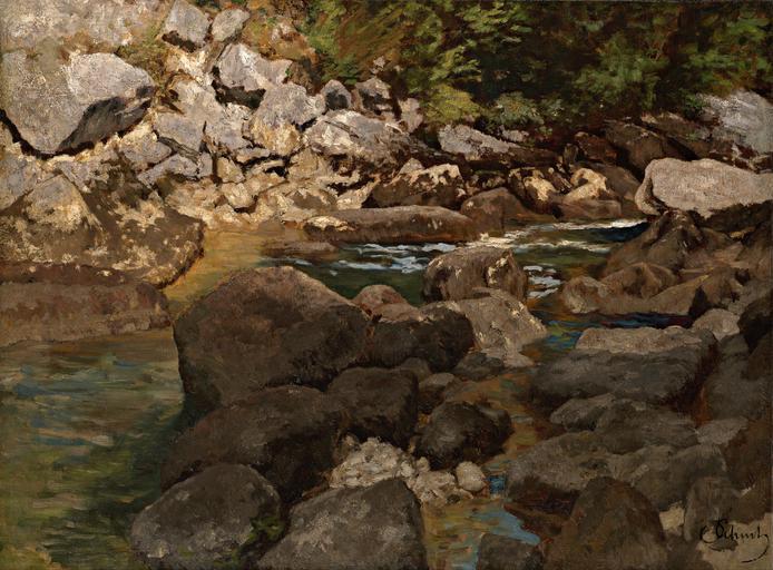 Keywords: Carl Schuch - Mountain Stream with Boulders - Google Art Project.jpg Gebirgsbach mit Felsblöcken Signatures _Inscriptions _and_Markings Signatute stamp below right CSchuch Oil on canvas special url_id YgFbbUuwHL_weA PD-old-100-1923 1903 Paintings by Carl Schuch Google Art Project works by Carl Schuch Leopold Museum collection Paintings of mountain streams |