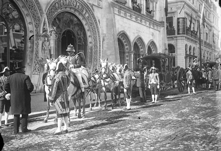 | Keywords: Carrosses royaux de Portugal et patron (Rocio).jpg Information_field GEH record <blockquote> Chusseau-Flaviens Ch French active 1890s-1910s TITLE ON OBJECT Carrosses royaux Portugal ca 1900-1919 negative gelatin on glass 9 x 12 cm Gift of Kodak Pathe 75 0111 4295 NON-GEH NUMBER 058 A 38C INSCRIPTION Carrosses royaux Portugal NOTES CATALOGUED 12/88 JBM SUBJECT people procession </blockquote> Institution George Eastman House http //www geh org/ar/chus/portugal/m197501114295_ful html http //www geh org/ar/strip06/m197501114295 jpg 1905-10-27 Charles Chusseau-Flaviens see below Carrosses royaux de Portugal Rocio jpg Information_field 1st uploaded as the 24 629 709<sup>th</sup> file in Wikimedia Commons removed border Medium69 restoration Lic PD-old Black and white photographs of Lisbon Photographs of Portugal by Charles Chusseau-Flaviens Photographs in the George Eastman House Collection Visit by Émile Loubet in Portugal 1905 Carriages in the 1900s Photographs taken on 1905-10-27 Exterior of Rossio train station Carriages in Lisbon |