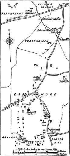 | Keywords: Carrowmore Megalithic Cemetery Map by W. G. Wood-Martin 1886.png Map of the Carrowmore Megalithic Cemetery by W G Wood-Martin as published in his article The Rude Stone Monuments of Ireland The Journal of the Royal Historical and Archaeological Association of Ireland Fourth Series 7 no 67 1886 470 “87 Original caption <br/>Map showing the arrangement of the principal group of Megalithic Structures in the district of Cuil-irra Co Sligo The site of a destroyed Rude Stone Monument or Circle is indicated by a Cross https //archive org/stream/journal02irelgoog page/n571/mode/2up p 485 of W G Wood-Martin The Rude Stone Monuments of Ireland The Journal of the Royal Historical and Archaeological Association of Ireland Fourth Series 7 no 67 1886 470 “87; this image was derived from the file journal02irelgoog_0573 tif extracted from https //archive org/download/journal02irelgoog/journal02irelgoog_tif zip journal02irelgoog_tif zip; the file was cropped the white background was made transparent and the format was converted to PNG 1886-07 William Gregory Wood-Martin 1847 “1917 see http //catalogue nli ie/Record/vtls000132150 NLI record PD-old-auto-1923 1917 Maps of Carrowmore County Sligo Megaliths maps |