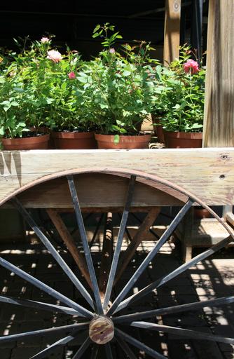 Keywords: cart wooden static display wheel round circular spokes plants potted