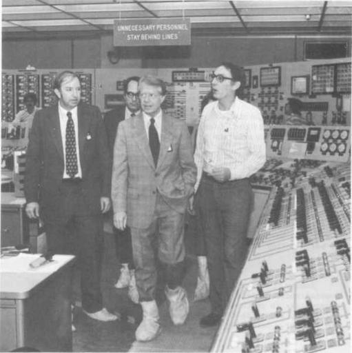 Keywords: Carter TMI-2.png en President Jimmy Carter touring the TMI-2 control room with l to r Harold Denton Governor Dick Thornburgh and James Floyd supervisor of TMI-2 operations on April 1 http //www threemileisland org/downloads/188 pdf Report of The President's Commission on the Accident at Three Mile Island The Need for Change The Legacy of TMI p 132 John G Kemeny et al 1979-10 PD-USGov Three Mile Island accident Jimmy Carter Dick Thornburgh |