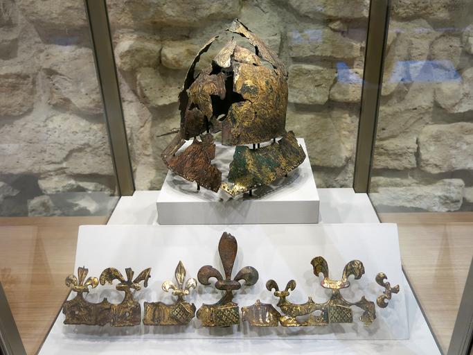 Keywords: Casque de parade de Charles VI (original).jpg en Original pieces of the helmet gilded of the king Charles VI It was found during the excavations of the Louvre castle for the creation of the Pyramid and exhibited in the medieval Louvre Paris France fr Morceaux originaux du casque de parade du roi Charles VI Il a été trouvé dans les fouilles du château du Louvre pour de la création de la Pyramide et exposée au Louvre médiéval Paris sf 2016-07-08 Tangopaso thumb left Reconstitution of the whole helmet Charles VI of France 15th-century helmets Helmets in art Objects found during the excavations of the Louvre castle for the creation of the Pyramid and exhibited in the medieval Louvre Palais du Louvre in 2016 |