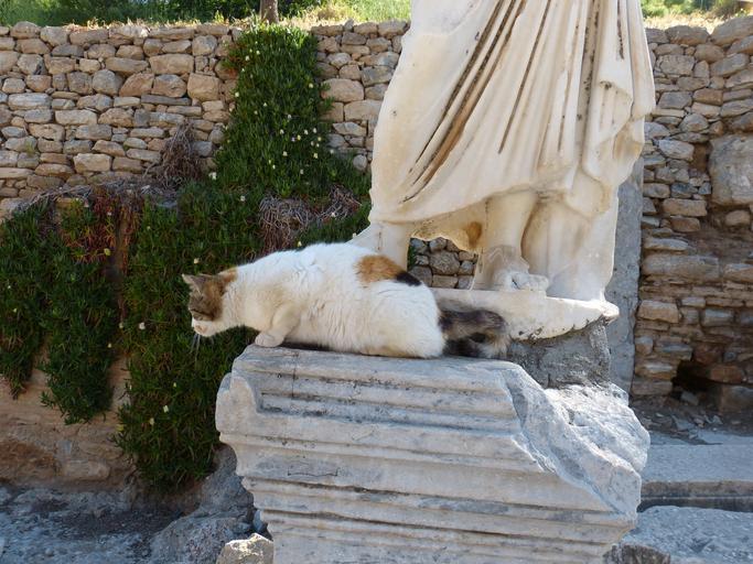 Keywords: cat animal mieze curious sit kitten ephesus turkey antique antiquity fig sculpture stone figure historically stone wall