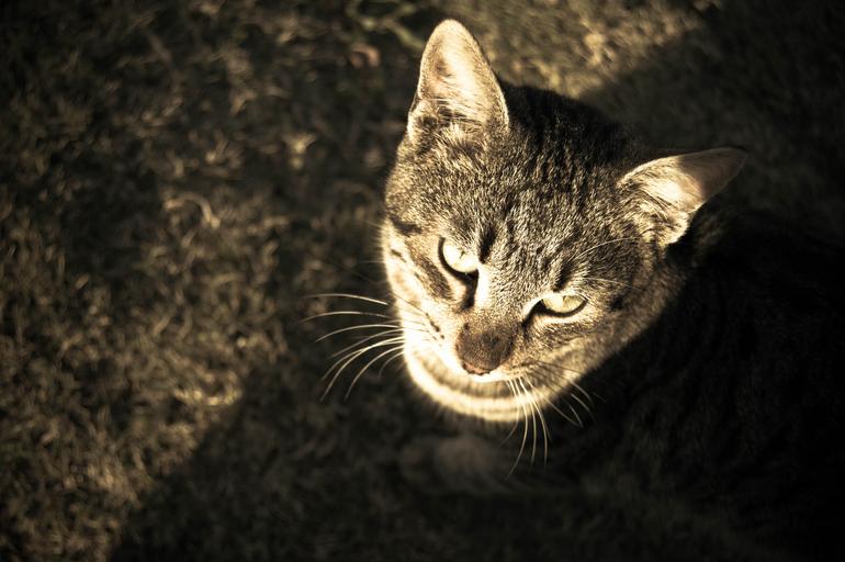 Keywords: cat animal pet sepia gray fur look up sunlight