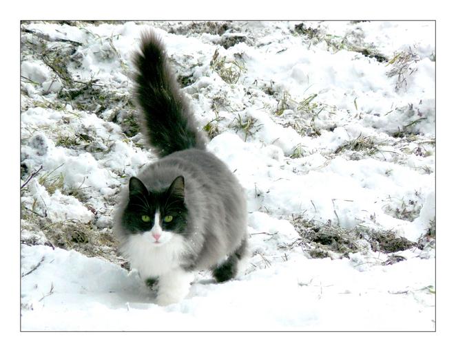 Keywords: cat animal snow pet cat face head domestic cat adidas animal world curious animals cat's eyes fur cute mammal german longhaired pointer winter meadow grass fresh black and white tail cattail