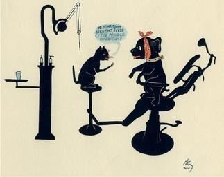 | Keywords: Cat, as dentist, holding dog’s tooth..JPG en In a dentist ™s office a cat sitting on a stool is holding the tooth it has just extracted from a dog sitting in the dental chair Dental drill and water fountain are to the left 2013-09-25 15 59 29 Courtesy of the National Library of Medicine Images from the History of Medicine IHM http //ihm nlm nih gov/images/A21912 Also showcased in the book Hidden Treasure New York NY Blast Books 2012 p 147 HMD Prints Photos call number WZ 336 E43 no 23 sol Elkan O artist Custom license marker 2013 09 25 PD-USGov Uploaded with UploadWizard Dental extraction Caricatures of dentists Dogs acting as humans in art Cats acting as humans in art Dental offices Dental equipment Caricatures of animals |