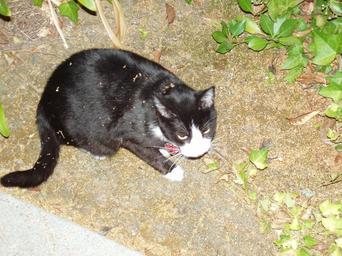 Keywords: Cat at night.JPG Black-and-white cat at night with flashlight and camera flash 2005-08-01 own assumed Imageman~commonswiki Tuxedo patterned black and white cats cats at night