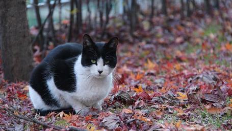 Keywords: cat autumn animal outdoors homeless pet catlike black and white fur