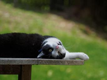 Keywords: cat black white portrait domestic cute pet feline kitty close laying wall resting whiskers paws furry bench