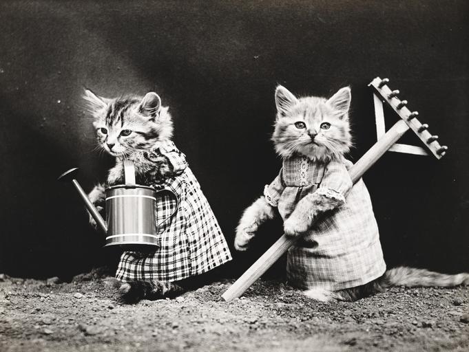 Keywords: cat cats kitten kittens dressed clothed cute vintage old photo image animal animals gardening rake watering can black white monochrome