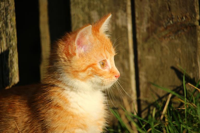 Keywords: cat kitten red mackerel tabby cat baby young cat red cat grass wooden wall