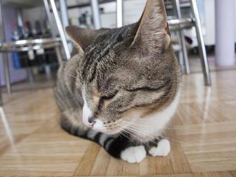 Keywords: cat pet mieze cat face head young cat domestic cat adidas animal snout datailaufnahme close mackerel whiskers cute tired relaxed eyes sleep quiet recovered feel at home tiefenschärfe big head misshapen wide angle side art