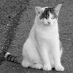 Keywords: cat road asphalt sit domestic cat white pet creature black and white