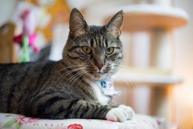 Keywords: cat sitting looking face portrait pet domestic feline cute eyes head resting kitty furry indoors tabby