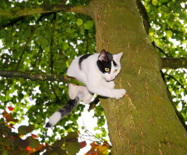 Keywords: cat tree climb young cat pet nature cat in the tree domestic cat in the free curious playful animal animal world black and white fur adidas