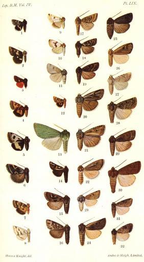 | Keywords: CATALOGUE-BM-LIX.jpg original en PLATE LVIX 1 Heliophana amaryllis m Vol IV p 14 California H11090 Schinia amaryllis Sm 1891 2 Pseudotamila perminuta m p 28 California H11091 Schinia perminuta Hy Edw 1881 3 Heliothis celeris m p 16 California H11209 Heliolonche celeris Grt 1873 4 H graefiana m p 17 California H11086 Schinia graefiana Tepper 1882 5 Dysocnemis belladonna f p 24 Utah H11080 Heliothis belladonna Hy Edw 1881 6 Lygranthoecia constricta m p 68 N Carolina H11135 Schinia rivulosa Gn 1852 7 L errans m p 64 Arizona H11124 Schinia errans Sm 1883 8 Schinia obliqua m p 82 Arizona H11196 Sm 1883 9 S oculata f p 75 Arizona H11197 Sm 1900 10 S ciliata m p 77 New Mexico H11200 Sm 1900 11 S diffusa m p 79 Colorado H11183 Sm 1891 12 S sordida m p 93 Texas H11112 Sm 1883 13 Isochlora chloroptera m p 128 Kashmir 14 Agrotiphila microreas f p 132 Hawaii 15 A alascae m p 133 Alaska H10983 Epipsiliamorpha alaskae Grt 1867 16 A staudingeri m p 133 Colorado H10980 Mösch 1862 17 Orosagrotis amphora m p 135 Kashmir 18 O incognita f p 135 Colorado H10866 Euxoa O incognita Sm 1893 19 O cashmirensis m p 136 Kashmir 20 Porosagrotis daedalus f p 140 Colorado H10642 Agrotis daedalus Sm 1890 21 P pluralis f p 141 Nevada H10795 Euxoa E pluralis Grt 1878 22 P dolli f p 141 Arizona H10643 Agrotis dolli Grt 1882 23 P siccata m p 142 Colorado H10811 Euxoa E siccata Sm 1893 24 P gypoetina m p 143 Argentina 25 P brachystria f p 143 Argentina 26 P longidens f p 145 Colorado H10699 Proragrotis longidens Sm 1890 27 P catenula m p 146 Colorado H10809 Euxoa E catenula Grt 1879 28 P satiens m p 147 Colorado H10792 Euxoa E satiens Sm 1890 29 P scortea m p 147 Mexico Laf Euxoa C scortea 30 P mimallonis m p 148 New York H10738Laf Euxoa P mimallonis Grt 1873 31 Micragrotis lacteata m p 150 Br E Africa 32 M puncticostata m p 151 Natal CATALOGUE OF THE NOCTUIDAE IN THE COLLECTION OF THE BRITISH MUSEUM Sir GEORGE F HAMPSON Bart 1903-1913 PD-old <gallery> File CLBM 04 Pl59 png Larger version </gallery> Heliophana amaryllis JPG Pseudotamila perminuta JPG Heliothis celeris JPG Heliothis graefiana JPG Dysocnemis belladonna JPG Lygranthoecia constricta JPG Lygranthoecia errans JPG Schinia obliqua JPG Schinia oculata JPG Schinia ciliata JPG Schinia diffusa JPG Schinia sordida JPG Isochlora chloroptera JPG Agrotiphila microreas JPG Agrotiphila alascae JPG Agrotiphila staudingeri JPG Orosagrotis amphora JPG Orosagrotis incognita JPG Orosagrotis cashmirensis JPG Porosagrotis daedalus JPG Porosagrotis pluralis JPG Eucoptocnemis dolli jpg Porosagrotis siccata JPG Porosagrotis gypoetina JPG Porosagrotis brachystria JPG Porosagrotis longidens JPG Porosagrotis catenula JPG Porosagrotis satiens JPG Porosagrotis scortea JPG Porosagrotis mimallonis JPG Micragrotis lacteata JPG Micragrotis_puncticostata JPG Catalogue of Lepidoptera Phalaenae in the British Museum Vol 4 |