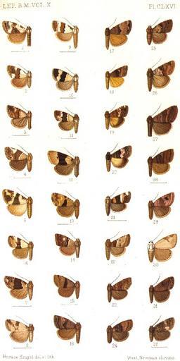Keywords: CATALOGUE-BM-PLATE CLXVI.jpg en PLATE CLXVI 1 Eustrotia noloides m Vol X p 583 Japan 2 E magna f p 583 Japan 3 E amorpha m p 584 Queensland 4 E albibasis f p 585 Natal 5 E olivula f p 586 Cape Colony 6 E erecta m p 586 Travancore 7 E latifasciata f p 587 Bombay 8 E inconcisa f p 587 Union Is 9 E thermozona m p 588 N Australia 10 E quadripartita m p 589 Punjab 11 E phaeozona m p 590 Christmas I 12 E euryzona f p 590 Madras 13 E lixiva m p 591 Arizona H9014 Cobubatha lixiva Grt 1882 14 E basicinerea f p 591 Arizona H9015 Cobubatha basicinerea Grt 1882 15 E orthozona m p 592 Texas H9017 Cobubatha orthozona Hamp 1910 16 E trigonodes m p 592 Br E Africa 17 E genuflexa m p 593 Cape Colony 18 E catoxantha m p 593 Orange R Colony 19 E albifascia f p 594 Cape Colony 20 E citripennis m p 594 Br E Africa 21 E leucopera m p 597 Madras 22 E dividua m p 597 Texas H9018 Cobubatha dividua Grt 1879 23 E longena f p 598 Venezuela 24 E phaeomera f p 599 W Africa 25 E isomera f p 599 Sikhim 26 E dimera m p 600 Assam 27 E excavata m p 601 Madras 28 E ozarbica m p 602 Madras 29 E culta f p 603 Japan 30 E semialba f p 604 Sikhim 31 E albisigna f p 604 N Rhodesia 32 E amydrozona m p 605 Br E Africa CATALOGUE OF THE NOCTUIDAE IN THE COLLECTION OF THE BRITISH MUSEUM Sir GEORGE F HAMPSON Bart 1903-1913 PD-old Catalogue of Lepidoptera Phalaenae in the British Museum Vol 10 Butterflies of Venezuela in plates |