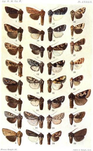 | Keywords: CATALOGUE-BM-PLATE LXXXIX.jpg en PLATE LXXXIX 1 Morrisonia tartaraea m Vol V p 381 New Zealand 2 M omoplaca f p 382 New Zealand Graphania omoplaca 3 M lignana m p 383 New Zealand Graphania lignana 4 M morosa m p 384 New Zealand Graphania morosa 5 M prionistis f p 384 New Zealand Graphania prionistis 6 M temperata m p 385 New Zealand 7 M phricias m p 385 New Zealand Graphania phricias 8 Persectania aulacias f p 387 New Zealand 9 P steropastis m p 388 New Zealand 10 Xylomania behrensiana f p 390 California H10485 Orthosia behrensiana Grt 1875 11 X erythrolita m p 390 California H10477 Orthosia erythrolita Grt 1879 12 X pallidior m p 391 Br Columbia H10506 Egira simplex Wlk 1865 13 X peritalis m p 392 Colorado H10508 Egira crucialis Harv 1875 a peritalis Sm 1892 14 X rubrica f p 393 California H10514 Egira rubrica Harv 1878 15 X indurata m p 395 Colorado H10511 Egira curialis Grt 1873 a indurata Sm 1894 16 X curialis m p 395 California H10511 Egira curialis Grt 1873 17 X candida m p 396 Vancouver H10512 Egira candida Sm 1894 18 X dolosa f p 396 Maine H10513 Egira dolosa Grt 1880 19 X perlubens m p 397 Washington H10515 Egira perlubens Grt 1881 20 X pulchella m p 399 Vancouver H10514 Egira rubrica Harv 1878 c pulchella Sm 1894 21 X bella m p 399 Japan Egira bella 22 X alternans f p 400 New York H10517 Egira alterans Wlk 1857 23 X patalis m p 400 California H10423 Lacinipolia patalis Grt 1873 24 X norma m p 401 Madagascar Maghadena norma 25 X natalensis f p 401 Natal 26 X v-album m p 402 Nilgiris Leucania valbum 27 Eriopyga utahensis m p 300 Utah H10547 Protorthodes utahensis Sm 1888 28 E trifascia m p 304 Colorado H10597 Hexorthodes trifascia Sm 1891 29 E reliqua f p 303 Colorado H10541 Homorthodes reliqua Sm 1899 Hypotrix reliqua 30 Perigrapha circumducta m p 403 W Turkestan 31 P pulchella f p 406 California H10478 Orthosia pulchella Harv 1876 32 P pectinata m p 407 California H10469 Perigonica pectinata Sm 1888 Perigonica pectinata CATALOGUE OF THE NOCTUIDAE IN THE COLLECTION OF THE BRITISH MUSEUM Sir GEORGE F HAMPSON Bart 1903-1913 PD-old Catalogue of Lepidoptera Phalaenae in the British Museum Vol 4 |