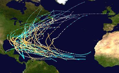 Keywords: Category 3 Atlantic hurricane tracks.png Track map of all hurricanes that have achieved Category 3 intensity in the Atlantic basin without reaching higher intensities The points show the location of the storm at 6-hour intervals The colour represents the storm's maximum sustained wind speeds as classified in the Saffir-Simpson Hurricane Scale see below and the shape of the data points represent the nature of the storm according to the legend below User Nilfanion/Tc/T Created by Titoxd using Wikipedia WikiProject Tropical cyclones/Tracks The background image is from NASA Tracking data from the National Hurricane Center <sup>http //www nhc noaa gov/pastall shtml</sup> 1887 “2009 Titoxd Tropical cyclone tracks Tropical cyclone tracks |
