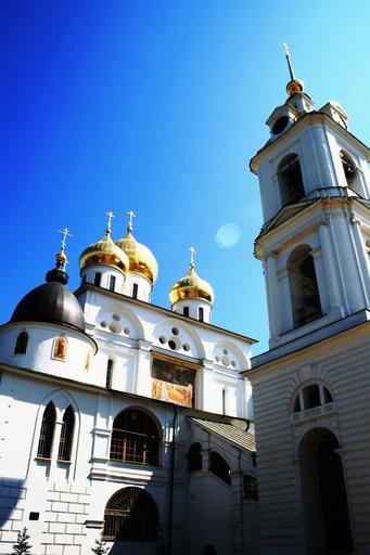 Keywords: cathedral church white building golden domes onion black domes religion russian orthodox towers arches sky historic