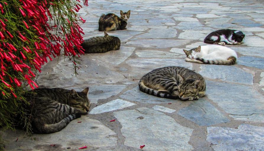 Keywords: cats resting sleeping cute animal kitten relax sleep adorable lazy lying courtyard monastery evagkelistria skiathos greece relaxation laziness funny