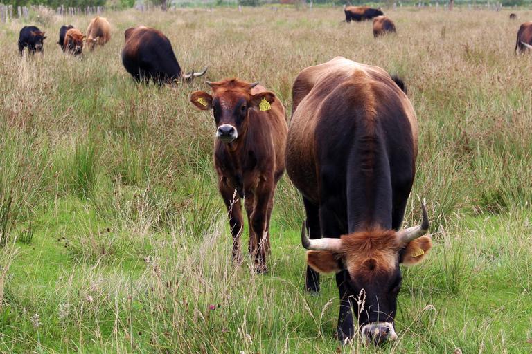 Keywords: cattle cows pasture graze nature horns cops livestock eyes mammal animal coupling calf young animal meadow brown green grass eat