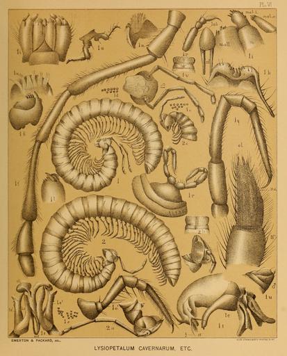 | Keywords: Cavefaunaofnorth00pack 0179.jpg en Plate VI Fig 1 Pseudotremia cavernarum Cope from Wyandotte Cave enlarged ” 1a head; 1b the same front view; 1d eyes Emerton del 1e eyes of a Wyandotte Cave specimen; 1f antenna much enlarged ; 1f' terminal joint highly magnified filled with nerve cells with numerous tactile setae and two tactile or olfactory rods at the end; 1g under lip or dentomala compare PI VIII fig 1f and explanation ; 1h labrum with the three central teeth; 1i external malella mal e internal malella mal i and labiella lab ; 1k mandible of one side; 1m the same on the other side ; 1n six bundles of setae on the free edge of lm; 1o eighth pair of legs; 1o' one of the legs enlarged; 1p a leg of the first pair next to the head ; 1q a leg of the last pair; 1r a pair of normal legs; 1s male genital armature ; 1t the same different view ; 1u end of the body ; 1v a segment dorsal view Author del Fig 2 P cavernarum var carterensia Pack enlarged ” 2a head enlarged; 2b side view of another specimen x6; 2c dorsal view of a segment Emerton del 1888 Packard A S 1888 https //archive org/details/cavefaunaofnorth00pack The cave fauna of North America with remarks on the anatomy of the brain and origin of the blind species Washington National Academy of Sciences 1888 James Henry Emerton and Alpheus Spring Packard other versions PD-old-70-1923 Uploaded with UploadWizard Diplopoda anatomy Pseudotremia The Cave Fauna of North America |